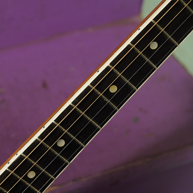 Condition notes: There's weather-checking to the finish here and there (with small cracks in the headstock veneer) but overall it's in great shape. It's mostly-original, though the head, tuners, and bridge are not. I'm thinking the hooks and nuts on the rim are replacements (but period), too, as the Vega ones are usually thicker and have a differently-sized nut.
