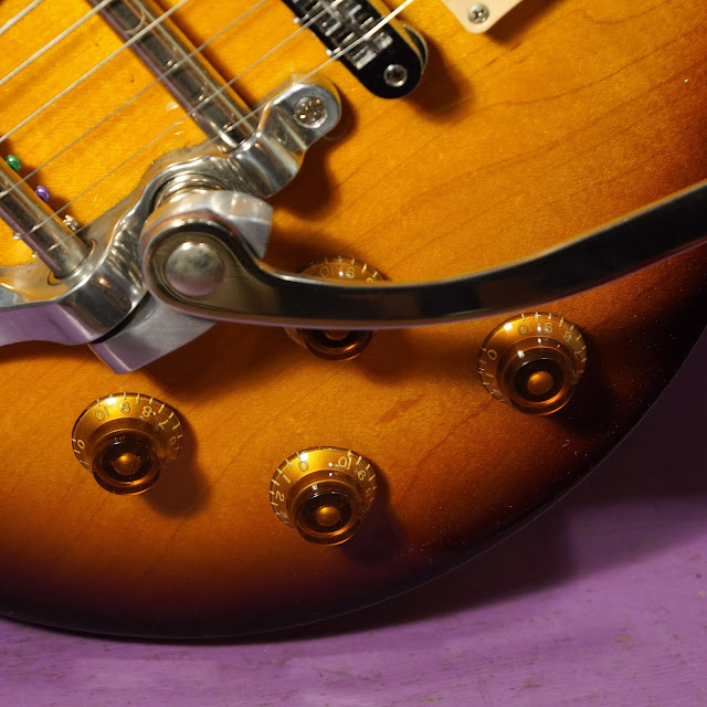 Interesting features: We added the Bigsby a while back and, as a result, the two studs for the original tailpiece are half-covered and not invisible. The Bigsby itself works either with string-over the downpressure bar (my preference) or string-under, if you like a tighter feel. The modern-style ABR bridge is a little more rugged and has farther adjustment room than the old traditional types.