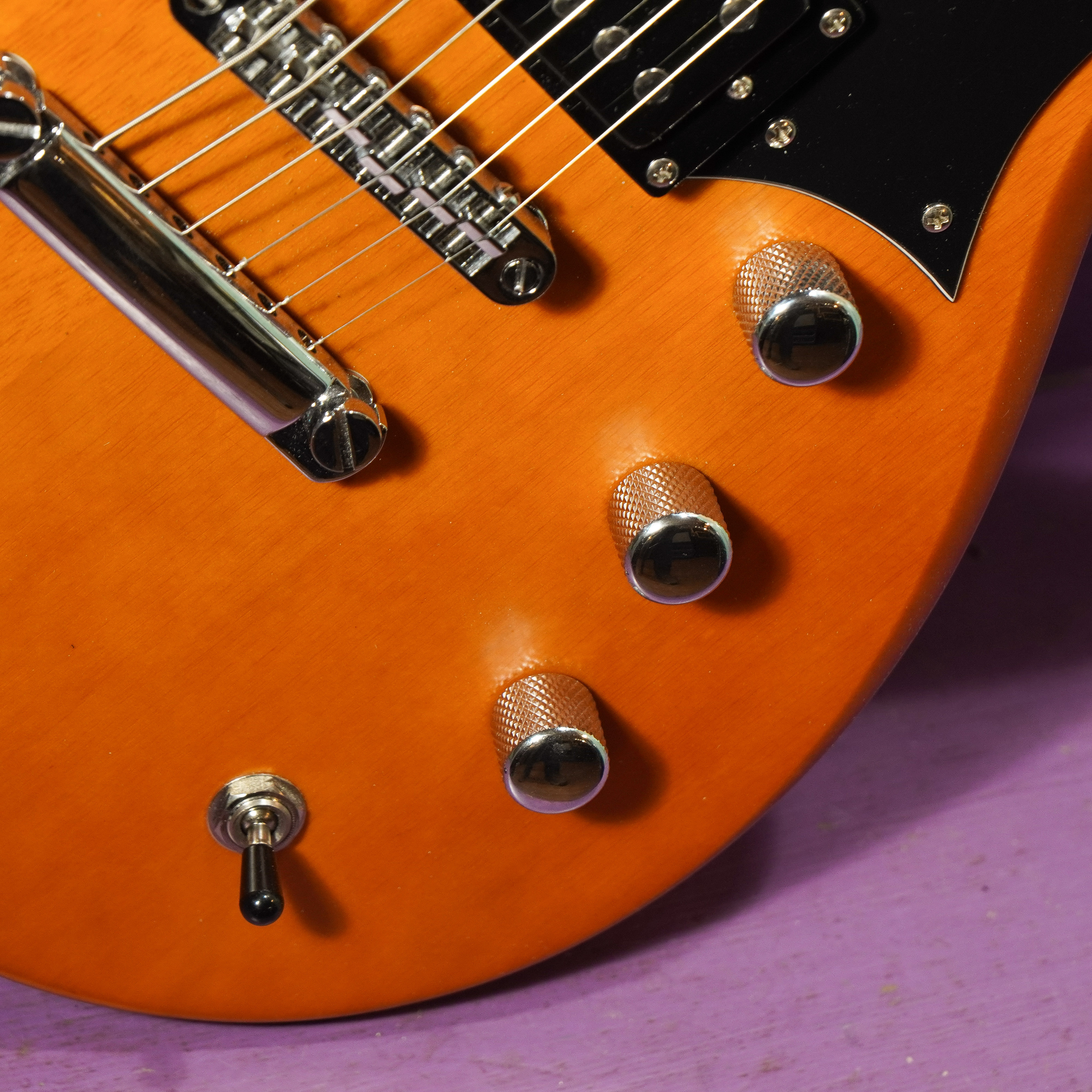 Interesting features: It's got a pair of Railhammer Bob Balch signature pickups, a trans-orange satin finish that pops-out like a '70s muscle car, and simple, functional appointments. I always really enjoy the bass rolloff knob (third knob) on Reverends because it lets you go from the big sound of these buckers right down to an almost Stratty or Tele-like or '60s Vox-like sound that's useful for "faux acoustic" or "strummed" or lightly-surfy stuff without killing the tone of the guitar.