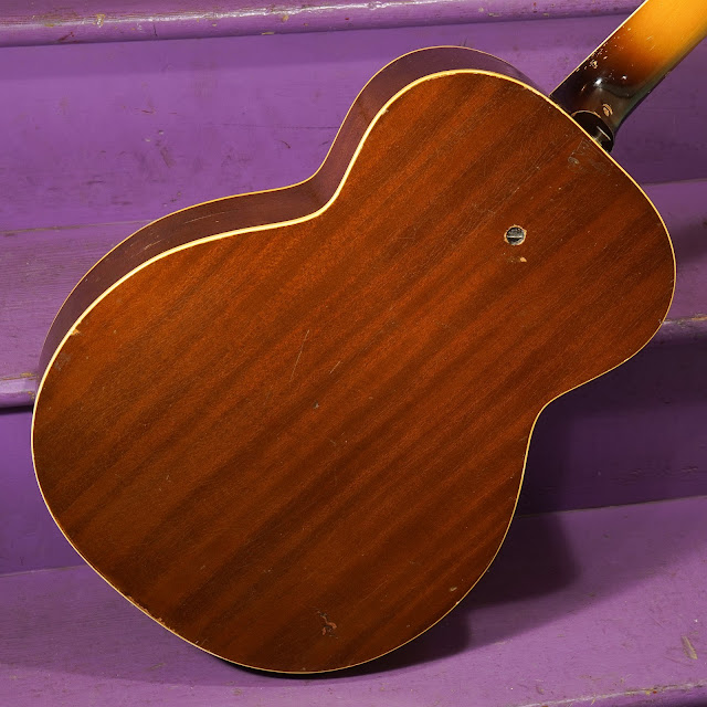 Condition notes: Overall it looks good but it has been modded. The cone cut-out hole has been enlarged some and a "soundwell" fit that hangs-down from the top. The pickup and pickup surround are not original and we had to hand-fit the pickup surround to fit better (the modder's job was a bit wonky). There's weather-check throughout the finish (crackles) and there are parts where the veneer shows hairline cracks. Because the whole body is 3-ply, it's a non-issue, however, and won't be a problem. There's wear and tear to the neck in spots and someone added a middle-position string tree for the D&G strings. The truss cover is a replacement. The truss works but is barely-engaged.