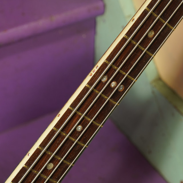 Interesting features: There's so much to like -- from the metallic-blue-sunburst-finished rear of the neck to the warped celluloid wrap all over the whole instrument giving it quirky curves and styling. The pickguard is truly something to behold -- it houses the wiring and jack and is fit as a wedge over the top with curved, molded edges and a recessed trim line -- it's so cool! The whole thing is bound. It has a rosewood fretboard with faux-pearl dots and then someone went and added rhinestones for side dots. The high-E portion of the fretboard rounds-over a lot and I recall reading some bad advertisement from period sources about this being some sort of "speed feature" as it relates to guitar. In this instance, the strings do not pass over that section, so it only serves to look cool. The tuners are parts-bin specials and have pearl-like buttons to match the rest of the trim. It, of course, has been modified to serve as a 4-string bass and has our now-standard rubber-saddle setup for these -- the rubber sits on a steel bar which then sits on adjuster posts for easy action adjustment. We reused an old Strat claw as a tailpiece. Yip!